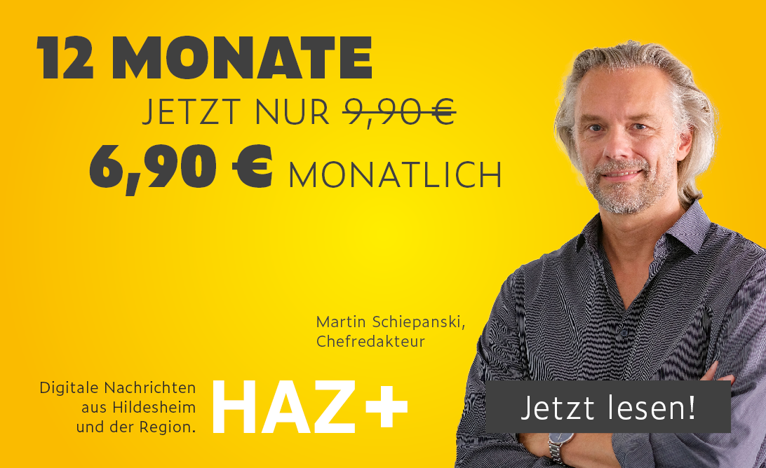 * Sie zahlen für Ihr zwölf-monatiges HAZ+ Abonnement monatlich nur 6,90 €. Im Anschluss lesen Sie HAZ+ zum derzeit gültigen Monatspreis von 11,90 € weiter. Wenn Sie dies nicht wünschen, informieren Sie uns bitte spätestens 7 Tage vor Ende der zwölf Monate (leserservice(at)hildesheimer-allgemeine.de). Nach dieser Frist ist HAZ+ monatlich kündbar.