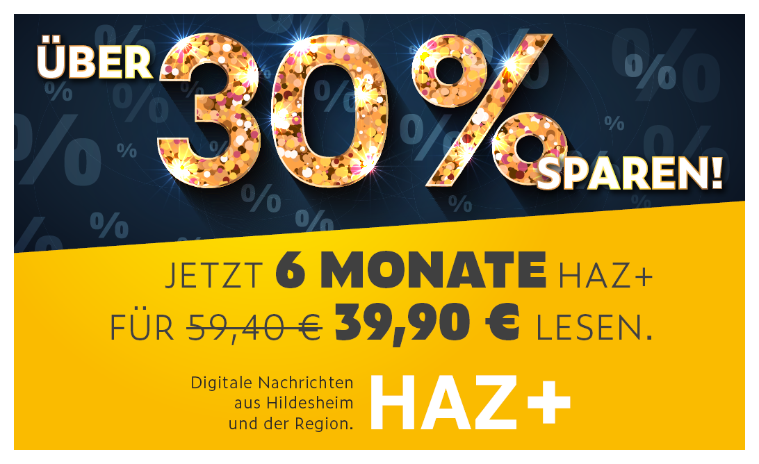* Sie zahlen für Ihr sechs-monatiges HAZ+ Abonnement nur einmalig 39,90 €. Im Anschluss lesen Sie HAZ+ zum derzeit gültigen Monatspreis von 11,90 € weiter. Wenn Sie dies nicht wünschen, informieren Sie uns bitte spätestens 7 Tage vor Ende der sechs Monate (leserservice(at)hildesheimer-allgemeine.de). Nach dieser Frist ist HAZ+ monatlich kündbar.