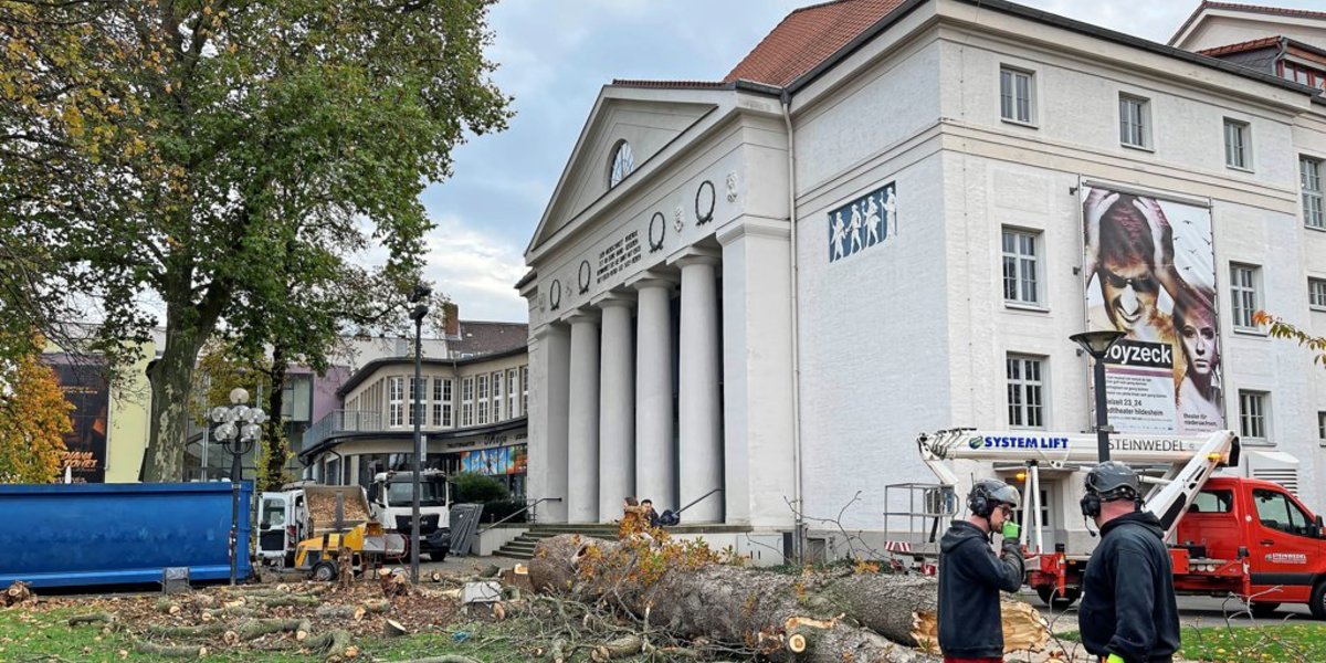 Hildesheim - Fünf Mitarbeiter der Firma Ginkgo haben am Montagmorgen eine rund 100 Jahre alte Rosskastanie an der Nordwest-Ecke des Theatervorplatzes in Hildesheim gefällt. Wie berichtet, hatte zuvor ein Baumgutachten ergeben, dass der etwa 22 Meter hohe Baum gefällt werden muss; Fäulnis hatte seinen Stamm von innen heraus ausgehöhlt, die Krone war bereits in Begriff abzusterben.