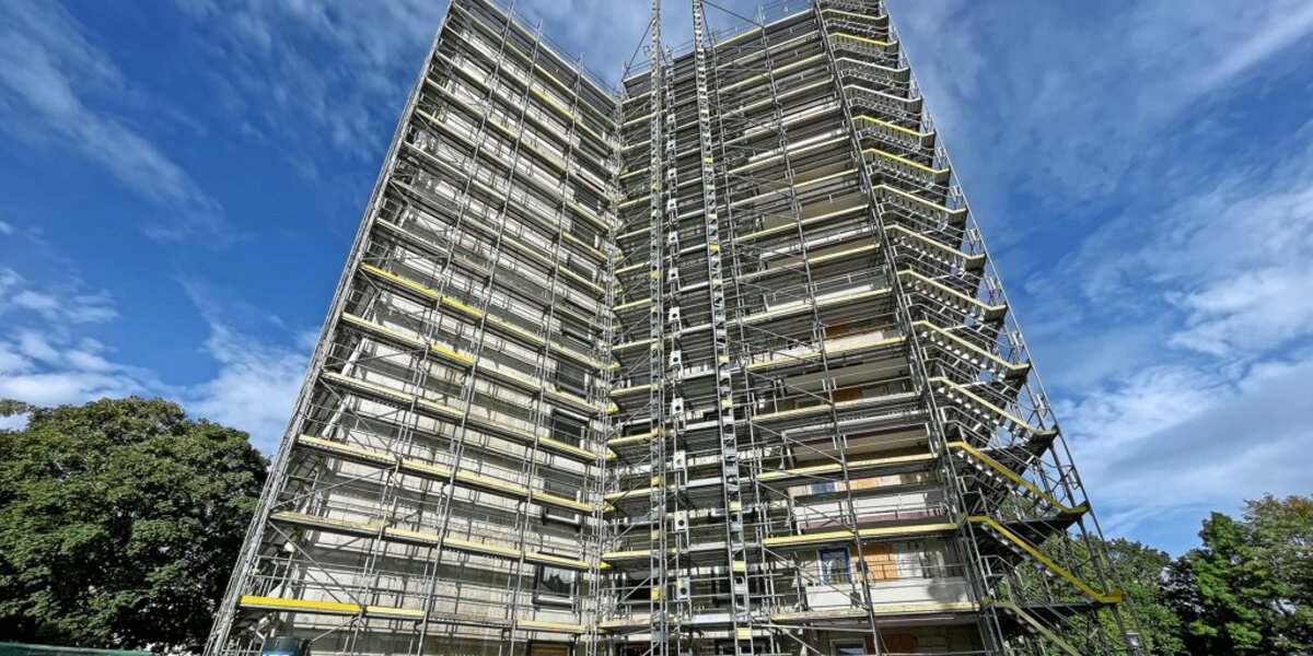 Das komplette Haus ist derzeit eingerüstet. „Wir haben zeitgleich etwa zehn Gewerke hier“, sagt Projektleiter Stephan Persin. Beim Gang durchs Gebäude lässt sich erkennen, dass kein Stein auf dem anderen bleibt. Der Blick fällt vielerorts auf nackten Beton. Fassade, Fenster, Treppenhäuser, Bäder und Küchen, Fußböden und Elektrik – spätestens im Frühjahr 2026 soll das Haus wie neu dastehen. Am auffälligsten wird dann wohl der komplett neue Eingangsbereich sein. „Hier kommt ein komplett neues Eingangsfoyer hin“, sagt Persin.