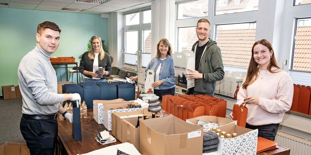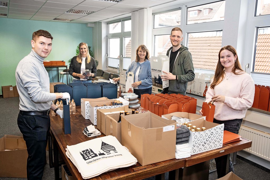 Auch außerhalb ihres kulinarischen Angebots wolle man zeigen, was die Region Hildesheim zu bieten habe, erklären Anja Kalde und Julia Hollemann. Sie gehören zur Agentur vonHier und haben in den vergangenen Tagen viele Kartons gefaltet und mit Produkten bestückt. „Die Hildesheim-Box enthält viele praktische Dinge für den Alltag“, weiß Kalde und denkt da zum Beispiel an die Trinkflasche oder das Gästehandtuch.