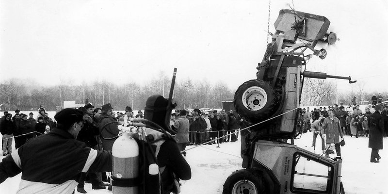 Glück im Unglück hatte der Bavenstedter Richard Grewe, der als Mitarbeiter des Gartenamtes mit seinem Allrad-Schlepper die Eisflächen des Hohnsnesees vom Schnee befreien wollte. Das Eis am Südufer war aber wohl noch nicht fest genug, Grewes Schlepper brach beim Räumen ein und versank sofort in den Fluten. Grewe blieb in letzter Sekunde nur die Flucht über das Dach. Bis zu den Knien wurde er noch nass, dann sackte das Fahrzeug endgültig unter ihm weg. Aufnahme vom 23. Januar 1987