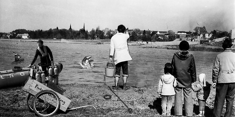 Viel Mühe erforderte auch die Bildbearbeitung für diesen gelungen Aprilscherz der Redaktion. Lang bevor Luchs, Wolf und Fischotter ihr Comeback in der heimischen Fauna feiern konnten, siedelte die HAZ einen neuen Bewohner im entstehenden Hohnsensee an. Einen Delfin mit dem sinnigen Namen „Apri“ hätte die Stadt per Flugzeug aus Miami via Hannover einfliegen lassen. Das Tier wäre eigens darauf trainiert, Nichtschwimmer im Bereich von Untiefen zurück ans Ufer zu drängen und bei Unglücksfällen einzugreifen. Aufnahme vom 1. April 1973