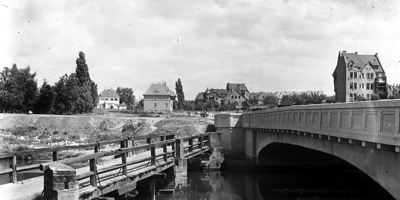 Der Name Hohnsensee erinnert wie die Brücke und die Straße an das im Mittelalter wüst gefallene Dorf, von dem sich bis 1634 noch die Hohnser Mühle an dieser Stelle erhalten hatte. Auf einem Foto friedlich vereint zeigen sich hier während der Bauarbeiten links die alte und rechts die neue Hohnser Brücke. Am 5. Oktober 1926 wurde die neue Brücke endgültig für den Fahrverkehr freigegeben, zu diesem Zeitpunkt war die alte Brücke bereits abgerissen, ihre Widerlager wurden vom 2. bis 4. Oktober 1926 gesprengt. Im Hintergrund der Aufnahme sind noch gut die parallel zum Brückenbau laufenden Pflasterarbeiten in Richtung Zimmerplatz und die Gebäude der ehemaligen Königlichen Baugewerkschule sowie erste Villen am südlichen Weinberg zu sehen. Aufnahme vom Juni 1926. Alle Fotos: Archiv Verlag Gebrüder Gerstenberg