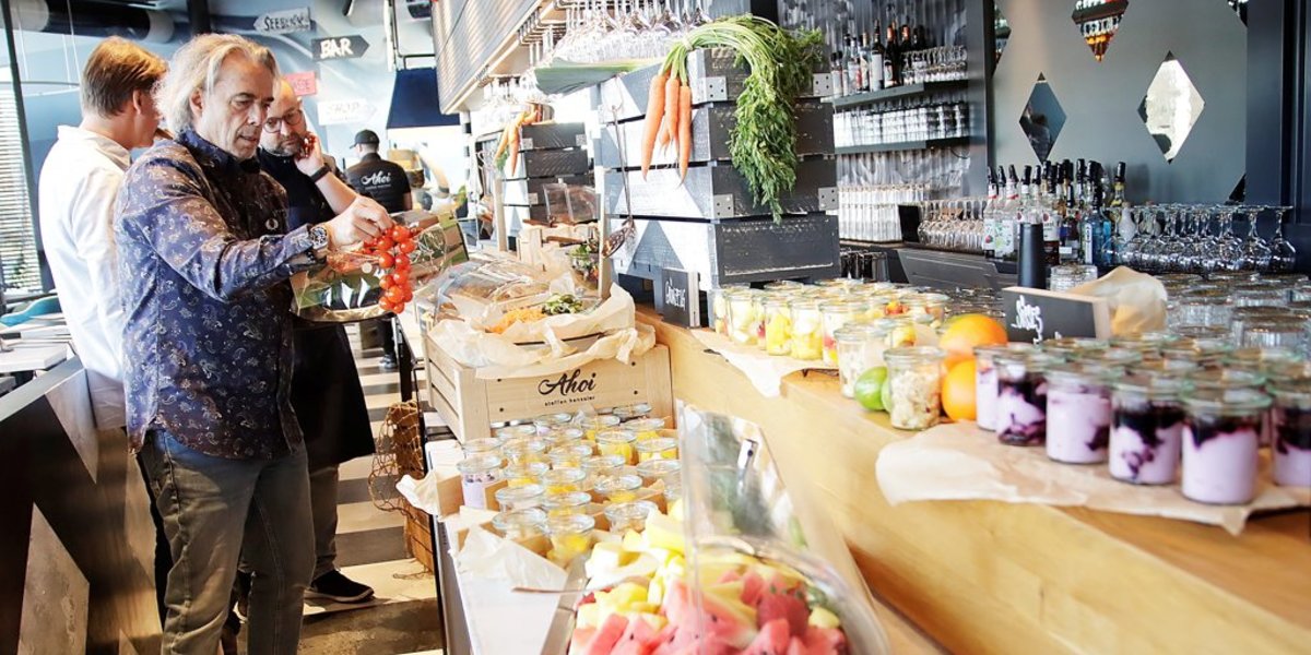 Nichts, aber auch gar nichts hat der österreichische Architekt und Interior-Designer Hubert Sterzinger bei der Ausgestaltung des Ahoi dem Zufall überlassen. Die beiden Sonnenterrassen mit dem Urlaubsblick über den See bieten 240 Sitzplätze in rustikalen Sesseln mit maritimen, blau-weiß-gestreiften Polstern. Im Innern gibt es 199 weitere Plätze, die zwischen mannshohen Pollern so geschickt gruppiert sind, dass sich die Gäste trotz der Größe des Raums auf jedem Platz behaglich fühlen.