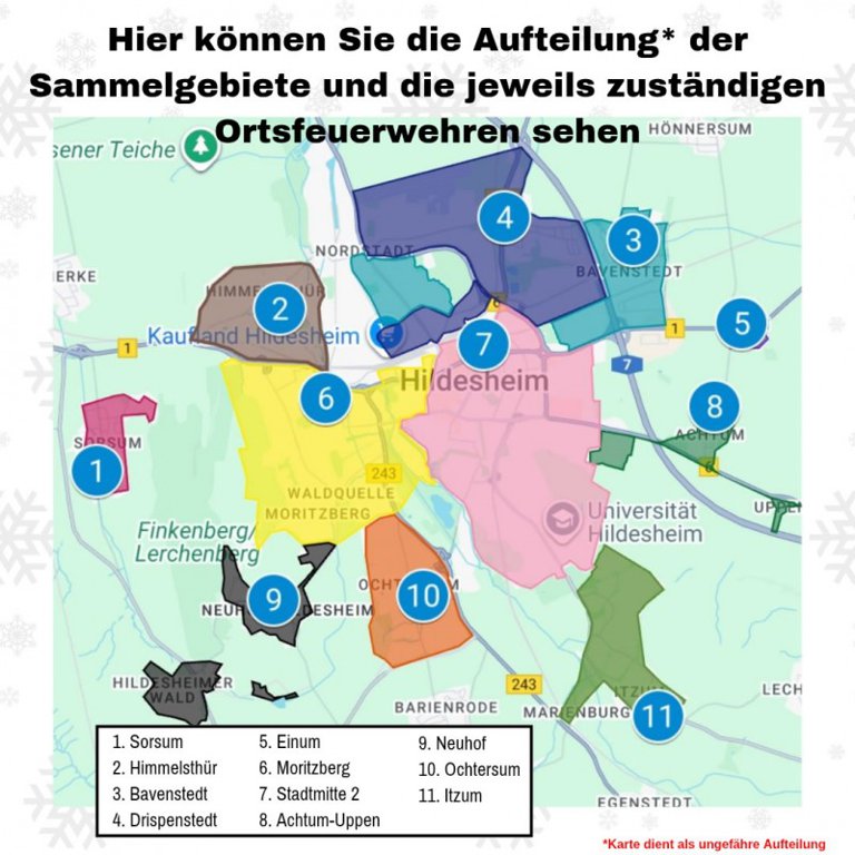 In den meisten Orten sammeln die Jugendfeuerwehren die Bäume ein. Im Hildesheimer Stadtgebiet und am Moritzberg hat die Feuerwehr in diesem Jahr aber auch verschiedene Sammelstellen eingerichtet, an denen man seinen Tannenbaum abgeben kann. Welche Möglichkeiten es in welchem Stadtteil gibt, darüber informieren die Jugendfeuerwehren über Zettel in den Briefkästen.