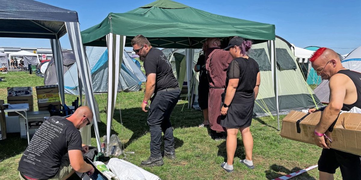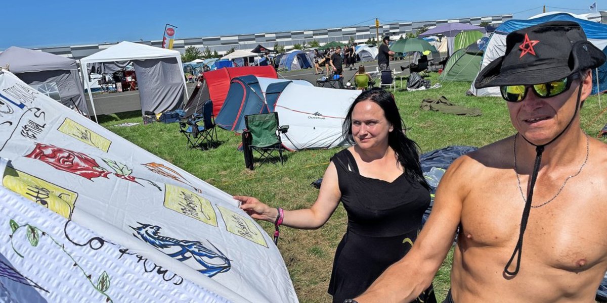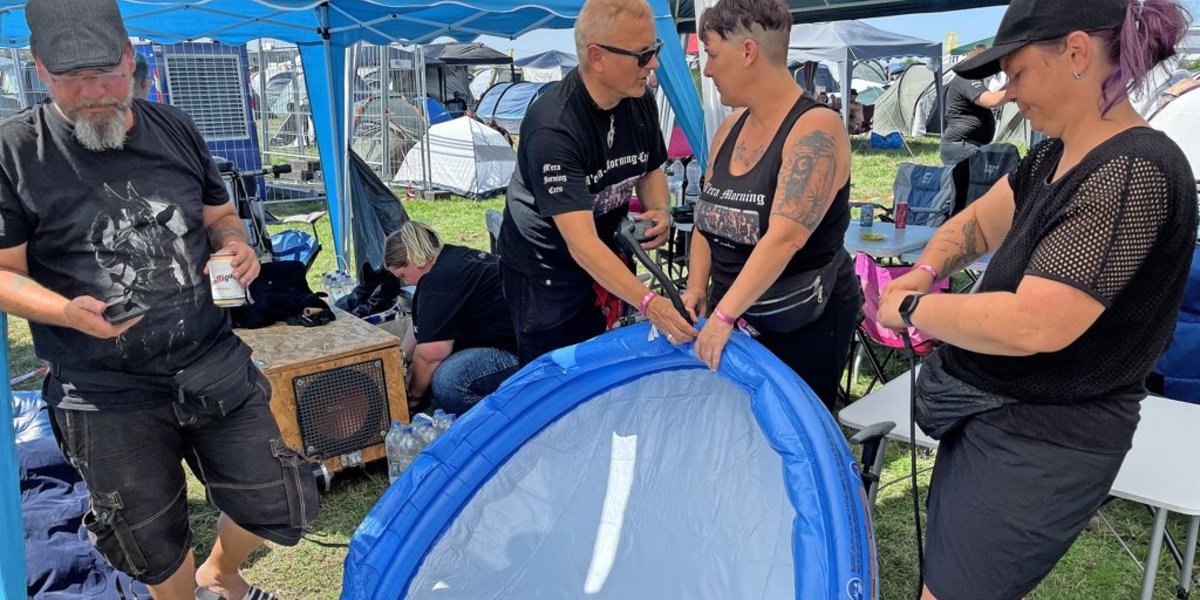 Die Stimmung ist ausgelassen. Nico dreht „Guten Morgen Sonnenschein“ von Nana Mouskouri auf, den Traditionssong der „Crew“, der mitunter in der Endlosschleife läuft. Dann wird der Babypool aufgeblasen, in dem die Getränke kühl bleiben sollen. Bald stehen auch die letzten Zelte. Das Festival kann beginnen.