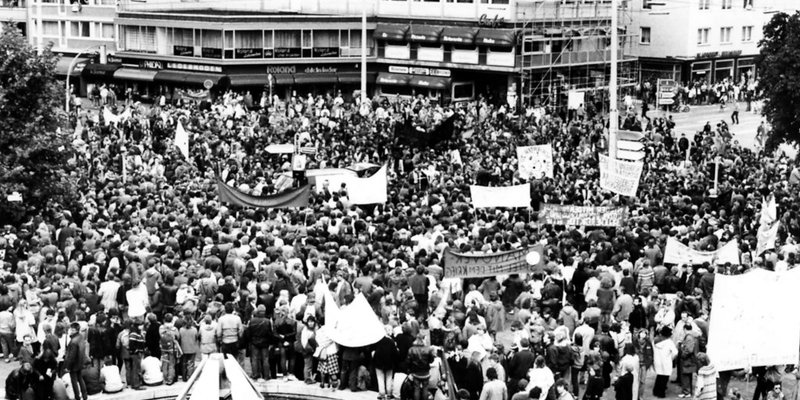 Mit dem NATO-Doppelbeschluss und dem Ende der sozialliberalen Koalition in Bonn wurde das Thema Aufrüstung zum zentralen Thema vieler Protestbewegungen, nicht erst seit der Wiedervereinigung gefolgt von dem Bemühen, dem Erstarken ausländerfeindlicher und rechtsradikaler Ideen entgegenzuwirken. In der Hochphase des Kalten Krieges zwischen den Weltmächten hielten Großmanöver die Region in Atem, gegen den atomaren Rüstungswettlauf zwischen SS-20 und Pershing II-Mittelstreckenraketen gingen im Sommer 1984 sechstausend Menschen auf die Straße. Hauptrednerin auf dem Hindenburgplatz war die evangelische Theologin Dorothee Sölle, die den „Wahnsinn der Politiker“ anprangerte. Aufnahme vom 24. September 1984, Archiv Verlag Gebrüder Gerstenberg.