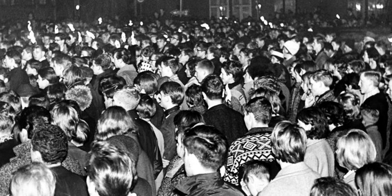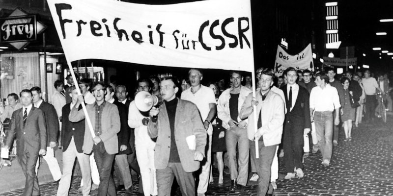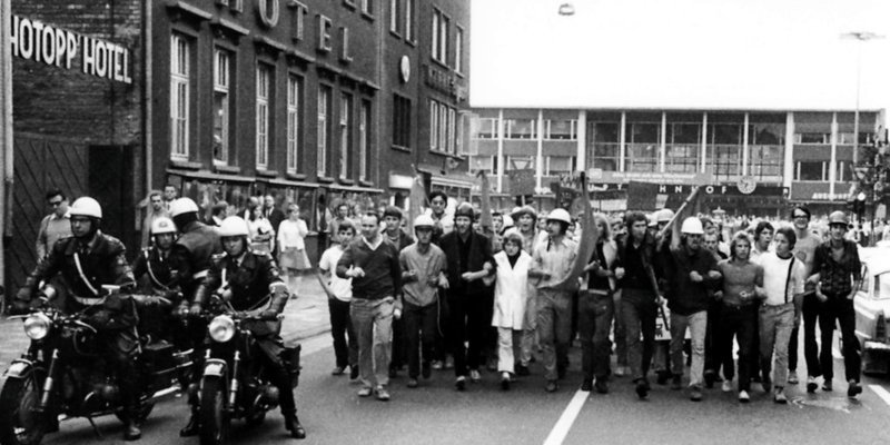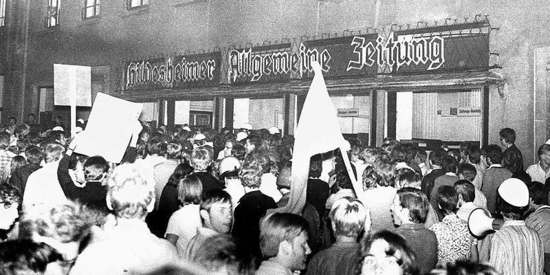 Das jähe und brutale Ende des „Prager Frühlings“ ließ die Gefahr konkreter werden, dass es nicht beim Kalten Krieg zwischen den Blöcken bleiben müsse. Beim Zeigen von Solidarität mit der Tschechoslowakei blieben die geballten Fäuste in der Tasche, man wollte halt zumindest „nicht stummgeblieben sein“. „Freiheit für CSSR“, die Abkürzung stand bis 1990 für „Tschechoslowakische Sozialistische Republik“, forderten wieder überwiegend junge Hildesheimer, als sie gegen die brutale Niederschlagung des „Prager Frühlings“ durch Truppen des Warschauer Paktes protestierten. Als die hannoversche Üstra die Fahrpreise drastisch erhöhen wollte, wurde die Region dagegen in den Sog der legendären „Rote-Punkt-Aktion“ gezogen, vornehmlich in Sarstedt kam es nun auch zu gewalttätigen Zusammenstößen zwischen Protestierenden und der Polizei, das Haus der Jugend wurde gestürmt und vorübergehend geschlossen, um der „Apo“ keine Operationszentrale zu bieten. Hinter der ominösen Abkürzung verbarg sich die mit der Studentenbewegung eng verbundene „Außerparlamentarische Opposition“. Aufnahme vom 22. August 1968, Archiv Verlag Gebrüder Gerstenberg