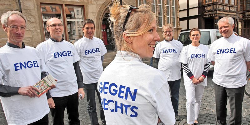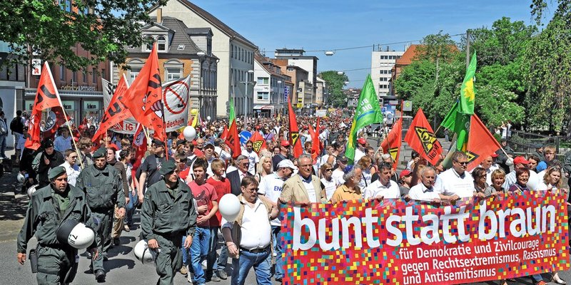 Um dem Neonazi-Aufmarsch in der Nordstadt ein starkes Signal aus der Mitte der Gesellschaft entgegenzusetzen, versammelten sich etwa 4000 Menschen aus allen Altersgruppen auf dem Angoulêmeplatz. Der Zug zum Theater stand unter dem Motto „bunt statt braun“. Aufnahme vom 5. Juni 2010, Archiv Verlag Gebrüder Gerstenberg.