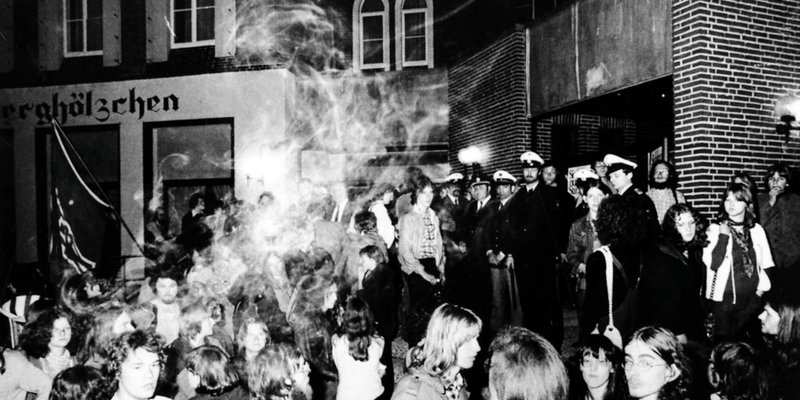 Die siebziger Jahre begannen, wie die sechziger aufgehört hatten. Kapitalismus- und allgemeine Gesellschaftskritik, der Kampf gegen den § 218, Berufsverbote, Atomkraft, die Bildungspolitik und die Pinochet-Diktatur waren Reizthemen, über die auch in der Bischofsstadt erbittert gestritten wurde. Ministerpräsident Ernst Albrecht zählte zu den entschiedenen Atomkraft-Befürwortern, was bei den Gegnern zu großem Unmut führte. Der Krawall entlud sich bei einem Auftritt im Berghölzchen, Störer hatten den Saal besetzt, intonierten Sprechchöre und ließen den Gast aus Hannover auch durch den Einsatz von Trillerpfeifen nicht zu Wort kommen. Als auch noch Stinkbomben geworfen wurden, ließ die Polizei das Lokal räumen. Aufnahme vom 21. Mai 1979, Archiv Verlag Gebrüder Gerstenberg.