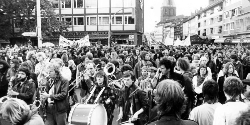 Eine etwas kurios anmutende Begleitung für eine Veranstaltung, die sich „Europa den Europäern, nicht den Militaristen“ auf die Fahnen geschrieben hatte: Der Anmarsch durch die Schuhstraße erfolgte unter den rhythmischen Klängen von Blasmusik. Aufnahme vom 24. September 1984, Archiv Verlag Gebrüder Gerstenberg.