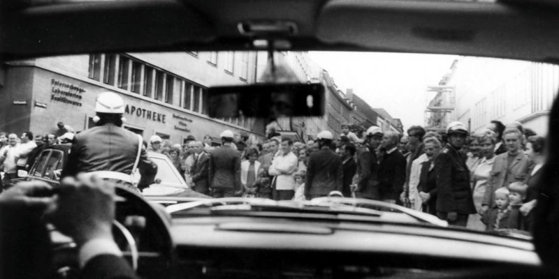 Kurt-Georg Kiesinger, dritter Bundeskanzler, sah sich nicht erst seit der spektakulären Ohrfeigen-Aktion von Beate Klasfeld wegen seiner Mitgliedschaft in der NSDAP scharfer Kritik und Rücktrittsforderungen ausgesetzt. Das bekam er auch bei seinem Auftritt an der Innerste zu spüren, die Stadtspitzen musten den Regierungschef auf dem weiträumig abgesperrten und nahezu menschenleeren Marktplatz begrüßen. Die Wagenkolonne wurde auf der Fahrt dorthin von der aus dem Zentrum verbannten Menge nicht gerade freudig empfangen, wie dieser Schnappschuss aus einer der Limousinen belegt. Aufnahme vom 26. August 1969, Archiv Verlag Gebrüder Gerstenberg