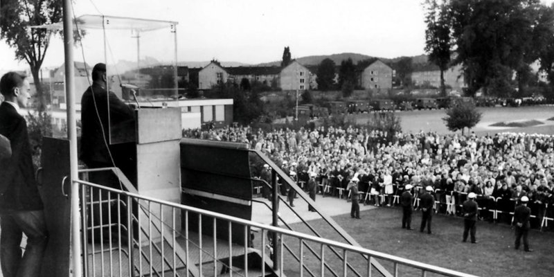 Der Bundestags-Wahlkampf 1969 bot reichlich Anlass, die Diskussion in der Öffentlichkeit zu führen, Besuche von Kanzler Kurt-Georg Kiesinger und Adolf von Thadden musste von einem Großaufgebot der Sicherheitskräfte gesichert werden, Regierungspräsident Günter Rabus wies den Vorwurf empört zurück, die Auftritte von Nazis geschützt zu haben, Grundlage der freiheitlichen Rechtsordnung sei die Garantie der Versammlungs- und Meinungsfreiheit. Rund 2000 Menschen versammelten sich vor der Sporthalle Pappelallee, um gegen den Auftritt des NPD-Vorsitzenden Adolf von Thadden zu demonstrieren oder gespannt seinen Worten zu lauschen. Eine Kanzel aus Plexiglas schützte den umstrittenen Redner, seine Partei verpasste beim Urgengang den Einzug in den Bundestag, was der sozialliberalen Koalition den Weg ebnete. Aufnahme vom 23. September 1969, Archiv Verlag Gebrüder Gerstenberg.