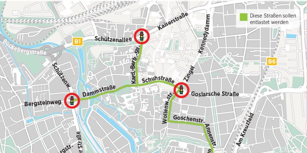 Hildesheim - Die Stadt will mit einer veränderten Ampelschaltung und einer neuen Spuraufteilung an vier Kreuzungen den Durchgangsverkehr aus dem Zentrum fernhalten: An diesem Montag beginnen die nötigen Arbeiten, sie erstrecken sich mindestens über die gesamten Herbstferien.