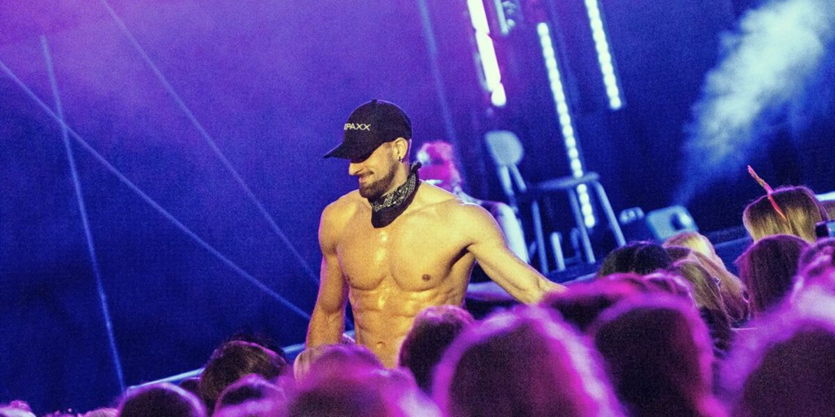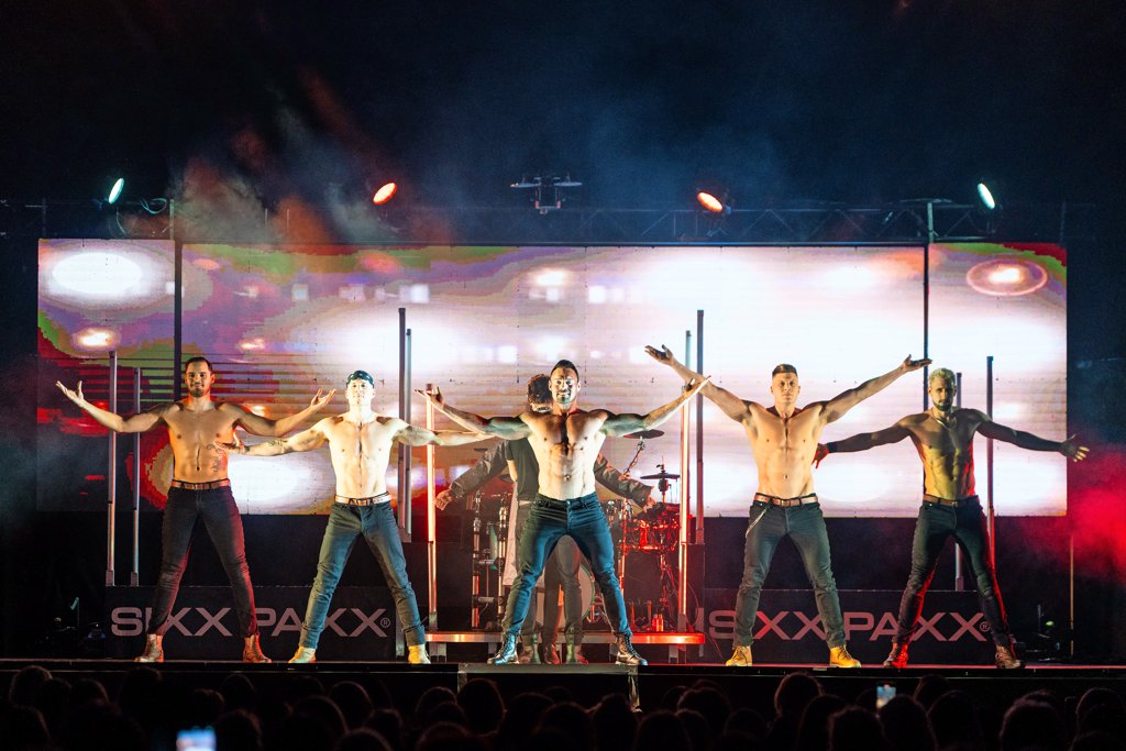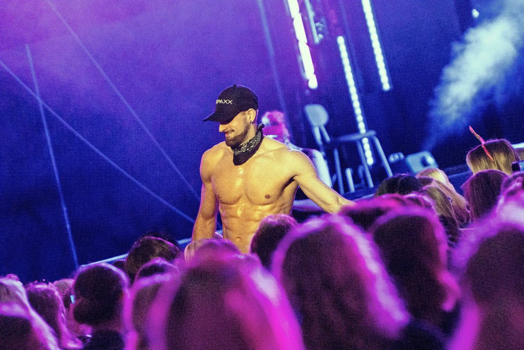 Um 20.45 Uhr – die Show dauert insgesamt drei Stunden – folgt der erste obszöne Gag. „Mach mal die Augen zu und den Mund auf“, sagt Taylor Smith (laut Website „100 Prozent höflich“) zu einer Freiwilligen. Das Publikum flippt sogleich aus. Insgesamt bleibt es bei den Frauen, die von den Sixx Paxx auf die Bühne geholt werden, halbwegs respektvoll. Selbst dann, wenn eine von ihnen an ein Andreaskreuz geschnallt und von drei nackten Pobacken kräftig bewackelt wird.