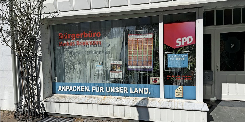 Laut Polizeisprecher Jan Makowski ist dies Standard, wann immer eine Straftat einen möglichen politischen Hintergrund hat – so etwa bei Angriffen auf Politikerinnen und Politiker oder auf Parteien und deren Räumlichkeiten. Im Fall des Sozialdemokraten Brinkmann schlugen die Unbekannten die Scheibe der Tür ein, warfen Eier ins Innere des Gebäudes und an das Schaufenster und entkamen anschließend unerkannt. „Wir wissen nicht, wer es war und warum die die Eier geworfen haben“, sagt Makowski. „Aber es ist nicht auszuschließen, dass das einen politisch motivierten Hintergrund hat.“