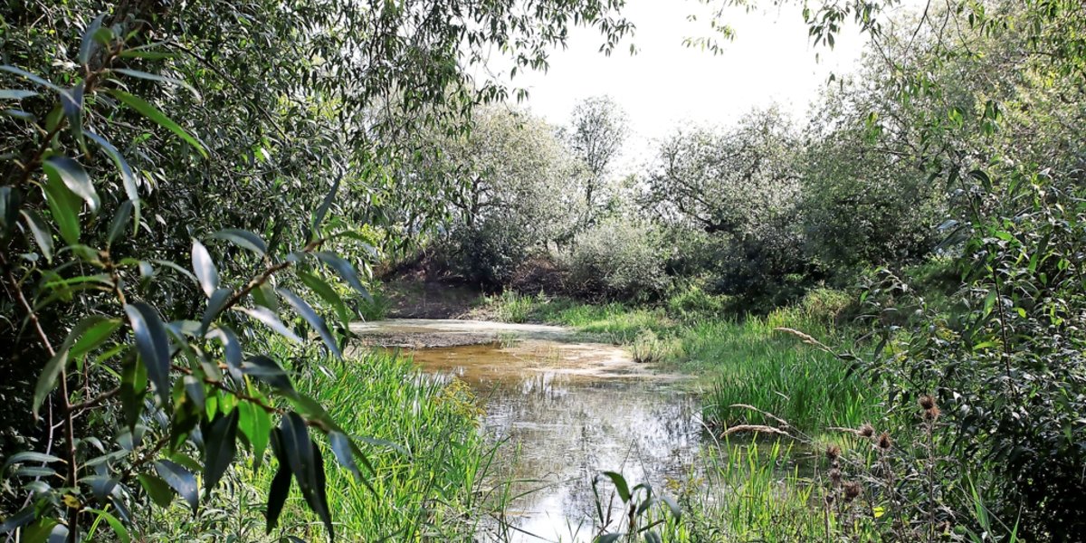 Wer die B 494 am Borsumer Pass überquert und dem Bruchgraben weiter folgt, kommt nach wenigen hundert Metern zu einem Wäldchen mit einem Teich mittendrin, der auf Luftbildern aussieht wie ein Meteoritenkrater. Ist es aber nicht. Günters Tränke ist ein idyllischer Tümpel, in dem sich Amphibien und Wasservögel wohlfühlen – und in dem neben Rohr- und Igelkolben die seltene Schwanenblume wächst. Und auch hier haben die Naturschützer Richtung Bruchgraben als grüne Brücke eine Streuobstwiese angelegt.