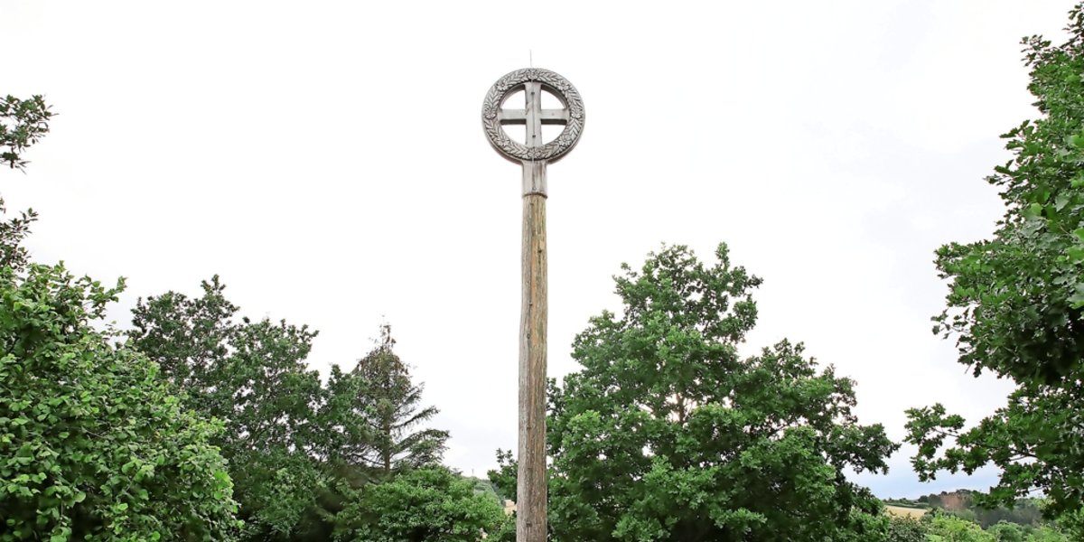 Der Nebel der Geschichte hindert die Irmenseuler aber nicht daran, auf ihre Vergangenheit stolz zu sein. So stolz, dass sie 1996 auf der Bornhöhe am Romberg, einem dem Ort vorgelagerten Hügel, eine frei empfundene Nachbildung der Irminsul aufgestellt haben. „Warum hier? Weil es hier oben schön ist“, sagt Schön. Den mächtigen, neun Meter hohen Eichenstamm ziert an der Spitze ein Radkreuz aus Aluminium-Guss, das einen Durchmesser von anderthalb Metern hat und in der Metallgießerei Wilhelm Funke in Röllinghausen entstanden ist. Das Motiv ist an das Ortswappen angelehnt. Eingeweiht wurde die Säule 1998 – zur 700-Jahr-Feier des Dorfes, das 1298 als „Ermensulle“ erstmals urkundlich erwähnt wurde.