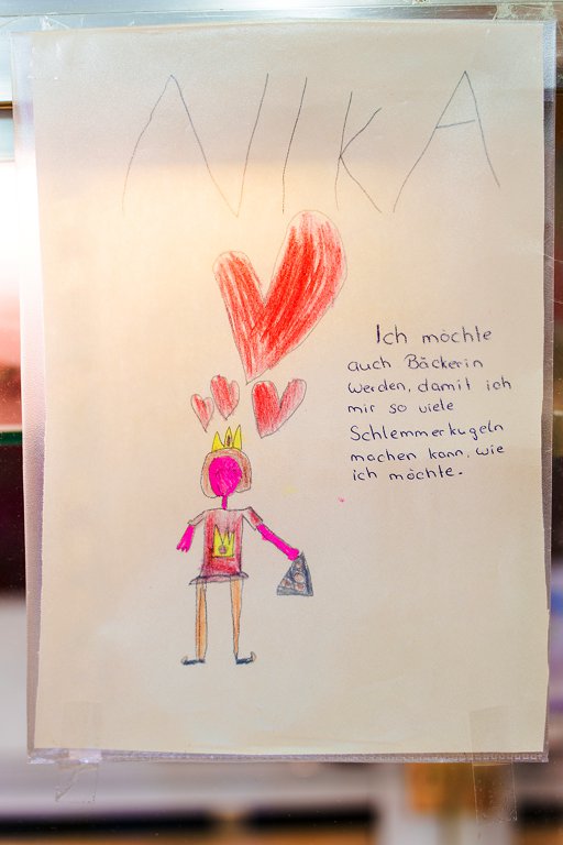 Häufig sei Helmer schon gefragt worden, ob er seine Rezepte weitergebe, aber die seien Privatsache, und so dürfte neben dem Brot so einiges schmerzlich vermisst werden. Die Nougatringe etwa, die Donauwelle – das letzte Blech ist gebacken – und die Schlemmerkugeln. Am Bäckertresen in Helmers kleinem Lebensmittelladen hängt ein Zettel, geschrieben von einem Mädchen: „Ich möchte Bäckerin werden, damit ich mir so viele Schlemmerkugeln machen kann, wie ich möchte.“ So etwas freut den Handwerker.
