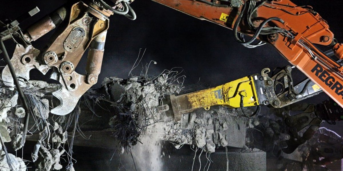 Hildesheim - Samstagmorgen, 7 Uhr: 1600 Tonnen Brückenreste liegen auf der Fahrbahn der Autobahn 7. Deren Belag wird durch eine dicke Schicht Sand geschützt, den die Abbruchfirma Regrata aus Verden vorher aufgehäuft hat. Nun sind fünf Bagger mit der Trennung des Brückenmaterials beschäftigt. Sie ziehen das Stahlgeflecht aus dem Beton und packen es in separate Container. Danach wird der Beton abgefahren. Alles wird wiederverwertet, der Stahl eingeschmolzen, der Beton geschreddert und auf anderen Baustelle genutzt.