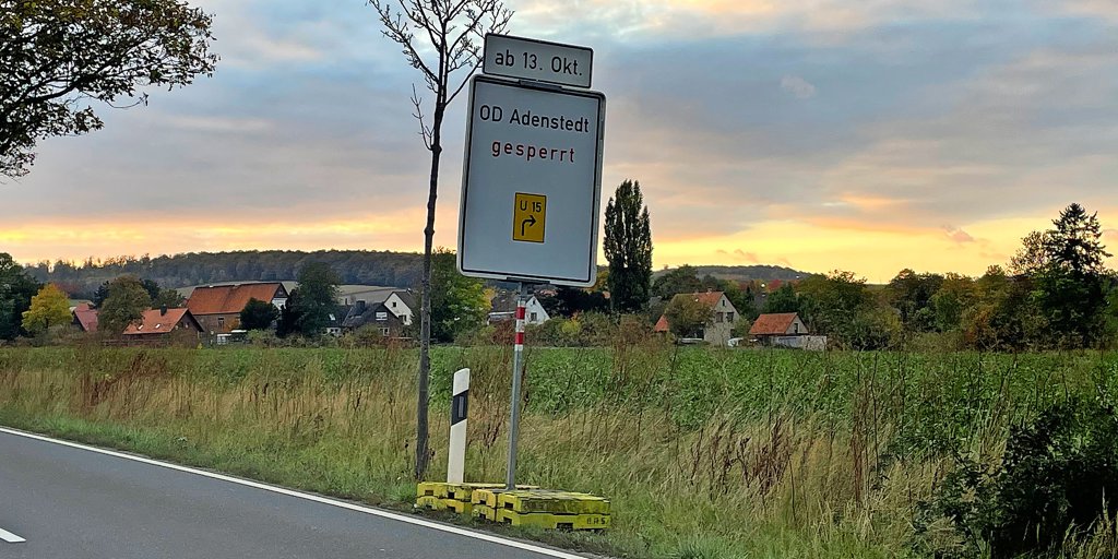 Wer von Alfeld aus in Richtung Bad Salzdetfurth fahren will - oder umgekehrt - muss sich vom 13. Oktober an auf einen Umweg einstellen: In Adenstedt wird ein Teil der Straße aufgerissen. Am Ortseingang weist ein Schild auf die bevorstehende Baustelle hin. Foto: Hanna Ilea Enkhardt