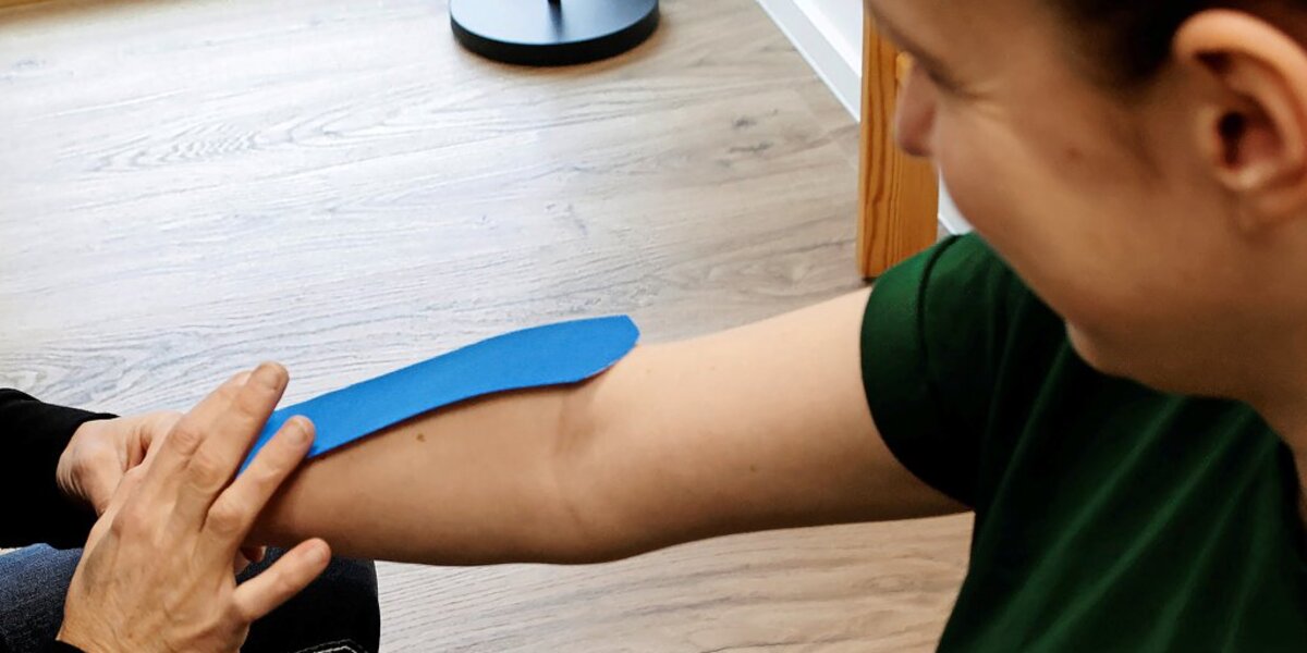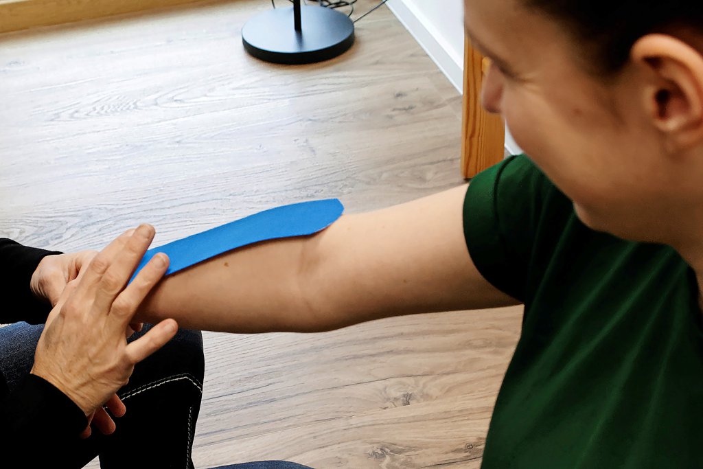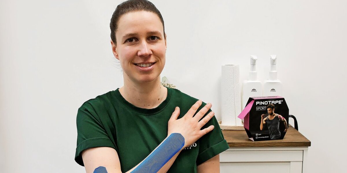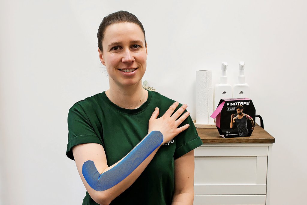Kinesio-Tapes kommen bei Profisportlern zur Schmerzreduktion nach Verletzungen zum Einsatz. Meuschke und ihr Team nutzen die Klebebänder auch zur Behandlung von Verspannungen oder dem klassischen Tennisarm. Warum? „Um Spannung von der Muskulatur runterzunehmen“, so die 32-Jährige. Sie ergänzt: „Bei jemandem, der sich die Bänder am Fußgelenk gerissen hat, kann man ein Stabilisations-Tape machen.“