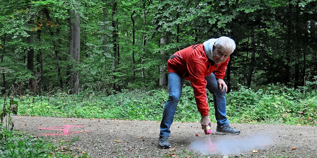 Hier geht es lang: Christian Rey markiert den Abbiegepfeil auf der einen Kilometer langen Strecke für die Kinder. Foto: Lars Lippert