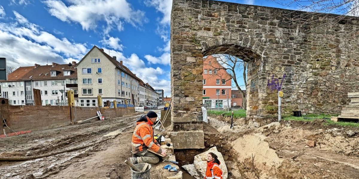 Ansonsten ist der südliche Teil der Brücke, der seit November komplett freigelegt war, bereits mit einem Vlies abgedeckt. Darüber kommt später Erde, dann die Betonplatte und am Ende schließlich die neue Fahrbahn der Dammstraße. Auf der Nordseite dürfen die Archäologen sich vor den abschließenden Arbeiten erstmals die Oberseite des 850 Jahre alten Bauwerks anschauen, dazu entsteht auf einer eher kleinen Fläche ein Grabungsschlitz.