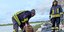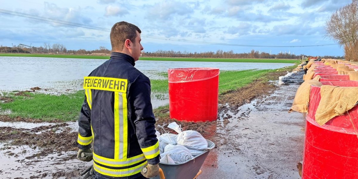 Um Barnten vor dem Wasser zu schützen, errichten die Einsatzkräfte Schutzwälle aus Bigpacks an der einen Seite des Ackers. An der anderen reihen sich rote, mit Wasser gefüllte Tonnen; AquaRiwa nennt sich das System. Das soll das Hochwasser umleiten, weg von Barnten. „Die Seen laufen über, weil die Leine reindrückt“, erklärt Trapp.