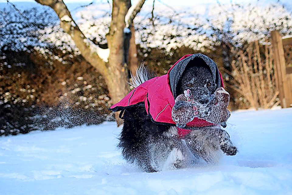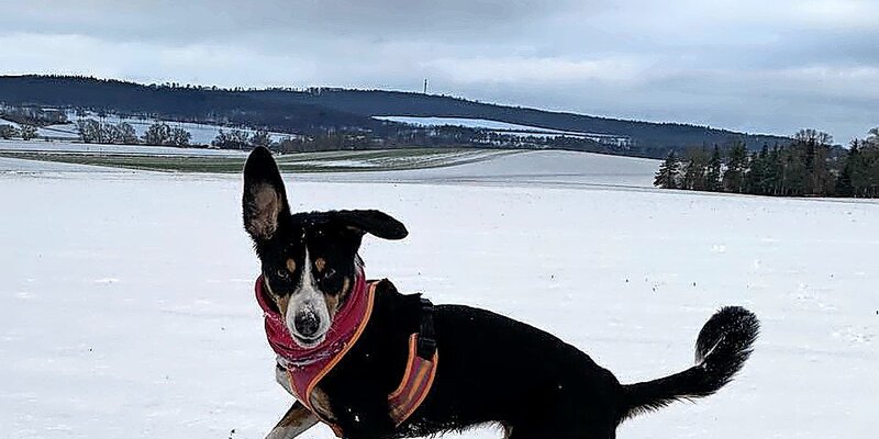 „Mo im Schnee“: Kathrin Lüder und das Foto ihrer gut eingepackten Hündin.
