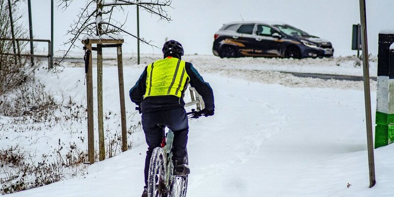 Díeser hartgesottene Mann kämpft sich mit dem Rad durch den Schnee. Foto: Fototeam May