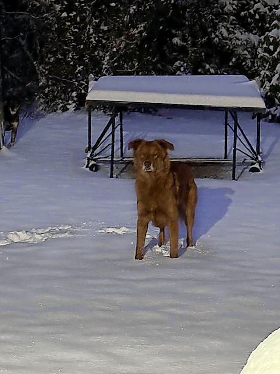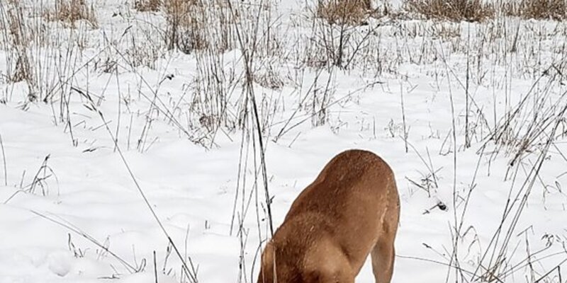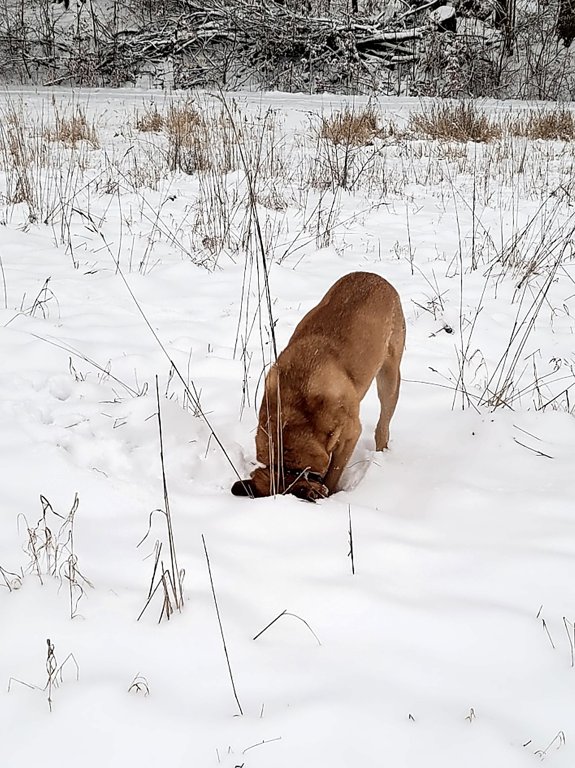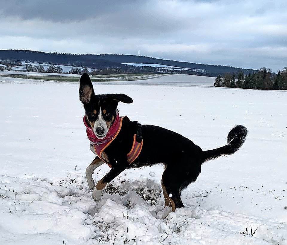 Der Hund von Claudia Rehhorn steckt den Kopf in den Schnee.