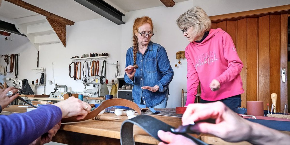Tatsächlich besitzt sie eine pragmatische Tatkraft, den Mut des Probierens. Genau wie ihre Besucherinnen: „Wie man Gürtel herstellt? Naja, wie soll man die schon herstellen, hab ich heute Morgen noch gedacht“, sagt Kati Krohne, eine von ihnen, und lacht. „Leder zuschneiden, auf einer Seite Löcher reinstanzen, auf der anderen die Gürtelschnalle anbringen, fertig.“ Aber so einfach ist es nicht, Leder ist kein Papier, es verlangt Konzentration und Kraft.