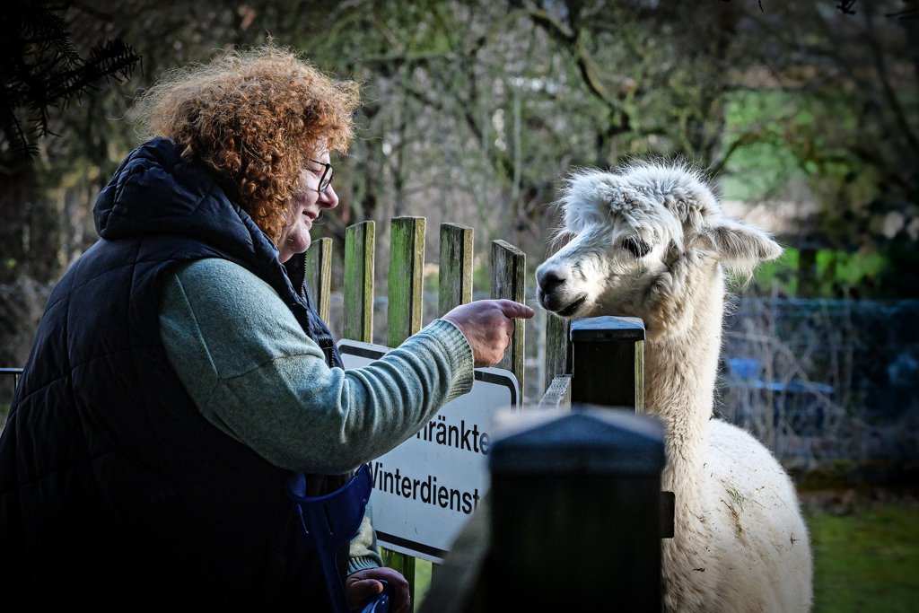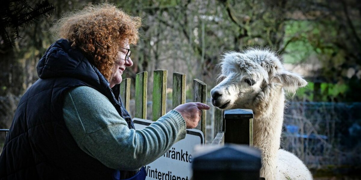 Etwa anderthalb Stunden machen sich die Schraders mit ihren Alpakas und den Gästen nach vorheriger Buchung auf den Weg. Hoch in Richtung Wald, durch die Felder. „Aber nur einen Spaziergang am Tag“, sagt Iris Schrader, „alles andere wäre den Tieren zu viel.“ Zu viel Neues, zu viel Fremdes, zu viele Stimmen, Eindrücke, Gerüche.