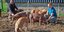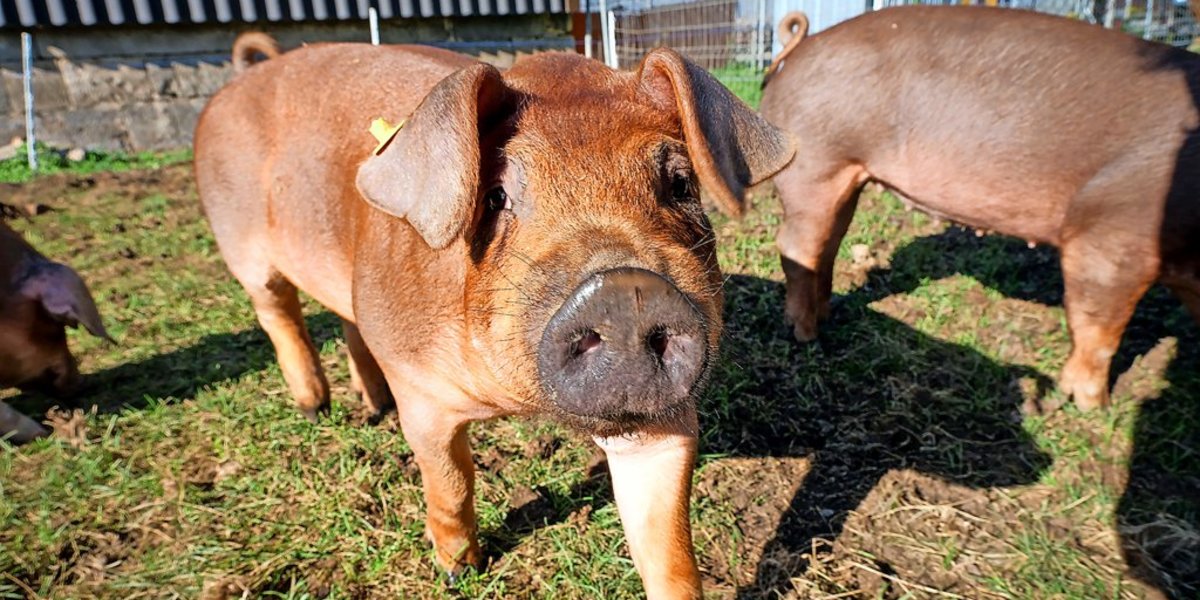Die Borsten der Piétrain-Duroc-Schweine leuchten nahezu golden in der Sonne. Berührungsängste haben die Sauen und Eber nicht. Neugrierig gehen sie auf die Menschen im Freilauf zu, ziehen am Hosenbein oder lassen sich ausgiebig streicheln. Ein Ball, Stroh und Baumstümpfe sind ihre Spielsachen und dann sind da die Artgenossen, mit den getobt, gebadet oder geschmust wird.