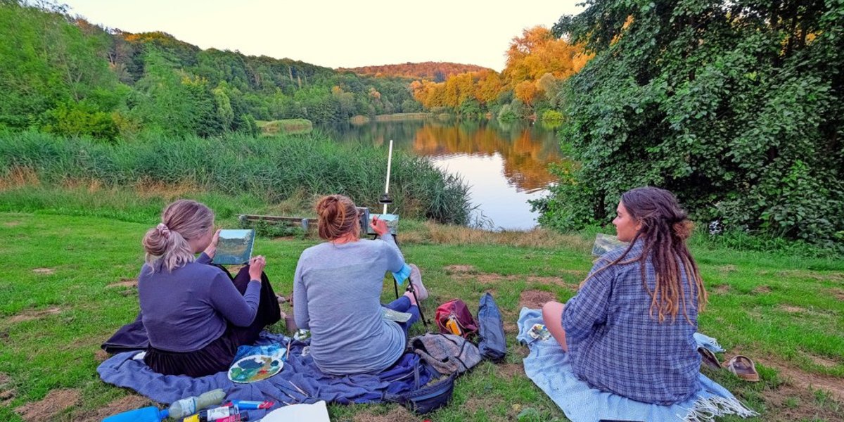 Etwas abseits haben sich drei junge Frauen niedergelassen und malen auf postkartengroßen Leinwänden die Tonkuhlenidylle. Jana Reitmayer lernt am TfN Kulissenmalerei, sie hat Hanna Drünert und Gilda Hosang zufällt hier am See gesehen und sich gleich zu ihr gesellt. Gemeinsam Zeichnen und Malen ist eben schöner. Die Tonkuhle ist eben ein Treffpunkt und für den Stadtteil ein Naherholungsgebiet – mit Spaßfaktor.