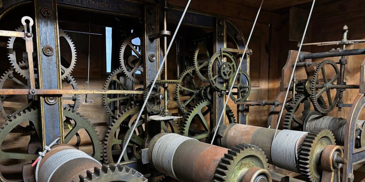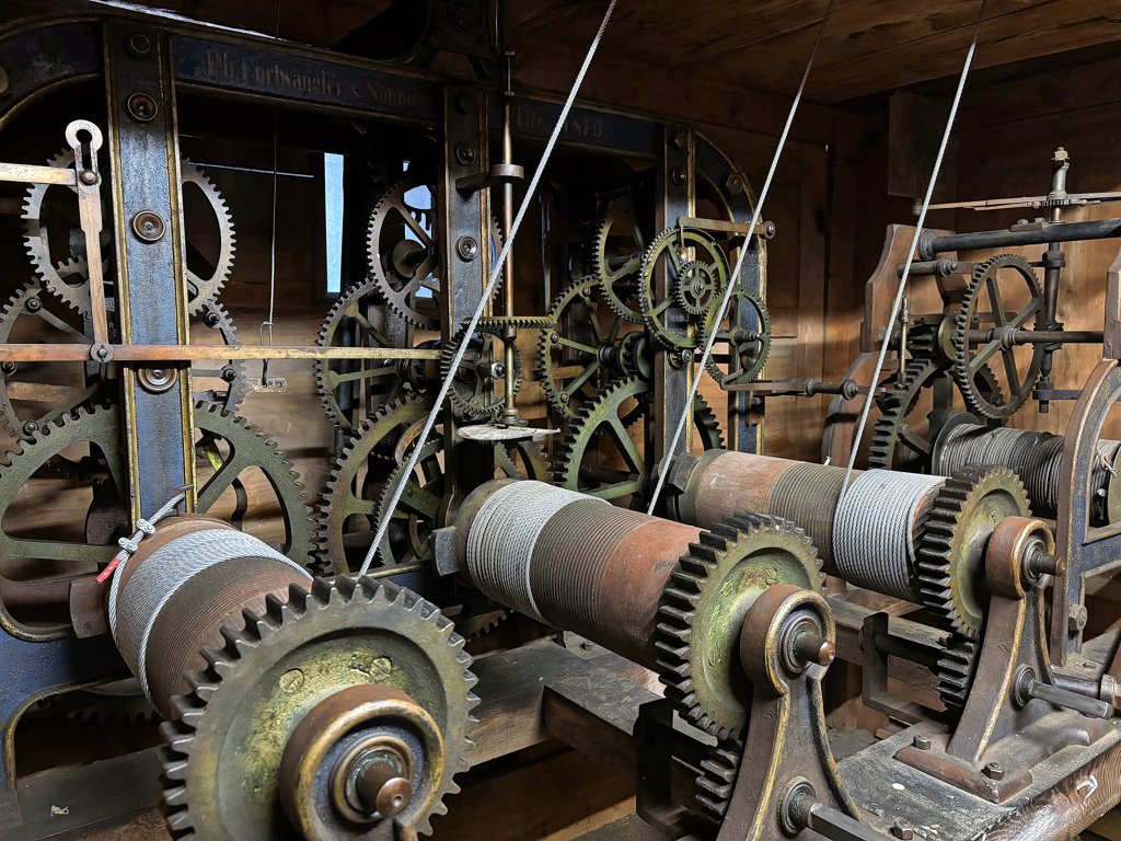Um die Uhr aufzuziehen, kurbeln die Männer drei Gewichte neben dem Getriebe der Uhr nach oben. Wie schwer die sind, können sie nicht genau sagen. „Ich könnte die aber nicht alleine hochheben“, sagt Gerth, „so 80 bis 120 Kilogramm werden die wiegen.“ Die Gewichte sind mit drei Spulen verbunden, je einer für den Stunden- und den Minutenzeiger sowie einer für das Viertelstundenmaß, das auch dafür sorgt, dass die Glocke alle 15 Minuten läutet. Einmal nach oben gekurbelt, benötigen die Gewichte etwa sieben Tage, bis sie wieder am Boden angekommen sind. So lange läuft die Uhr. Kurbelt man sie dann nicht wieder nach oben, bleibt die Uhr stehen. „Das war das letzte Mal vor etwa einem Vierteljahr der Fall. Da hat mich der Pastor am Sonntagnachmittag angerufen und mir gesagt, dass irgendwas mit der Uhr nicht stimmt“, berichtet Deutschle. Er habe die Gewichte dann genau zu der Uhrzeit wieder hochgekurbelt, zu der die Uhr stehen geblieben war – und dann das Pendel angestoßen. „So erspart man sich die Feinarbeit am Ziffernblatt. Man muss schließlich auch darauf achten, dass die Viertelstunde genau richtig eingestellt ist.“