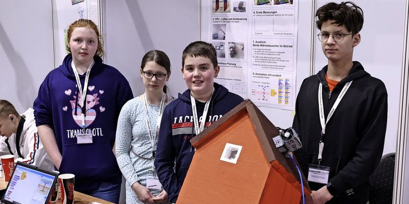 Sarah Plitzko, Phil Schrader und Edward Schreiber vom Scharnhorstgymnasium wollten herausfinden, ob sich Klassenzimmer nicht besser mit einem sogenannten Gegenstromwärmetauscher lüften lassen. Diese heizen den Raum zusätzlich. Um das zu testen, haben die drei ein kleines Haus aus Styropor nachgebaut. Die Idee dazu brachte ihnen die Corona-Pandemie – und das regelmäßige Lüften an kalten Wintertagen. Fotos: Julia Moras