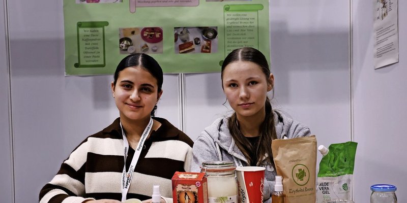 Arina Fibich und Yasmin Omeirat von der Renataschule wollten testen, welche Mittel die Haut am besten bräunen – ohne dafür eigens in den Urlaub fahren zu müssen, erklärt Fiebich. Dafür zerschnitten sie eine Speckschwarte, trugen die unterschiedlichen Mittel auf und beobachteten, welcher Braunton sich am deutlichsten hielt. Laut Omeirat stehen hierbei Kaffee- und Henna-Mittel an vorderster Stelle.