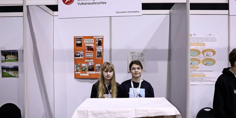 Mia Ballauf, Alexandra Selle und Miguel Castilho Marcao vom Gymnasium Himmelsthür haben für ihren Test einen eigenen Mini-Vulkan gebaut. In den Schlot legten sie Asche, die sie mit einer Luftpumpe nach oben wirbelten – fast wie ein richtiger Ausbruch. Dabei beobachteten sie, wie sich die Asche auf die umliegenden Pflanzen auswirkte. Besonders hart traf es dabei die Kresse am Fuße des Vulkans, sagt Ballauf. Dafür wuchsen dort neue Pilze, ergänzt Selle. Der dritte im Bunde, Castilho Marcao, war beim Regionalwettbewerb am Mittwoch verhindert.