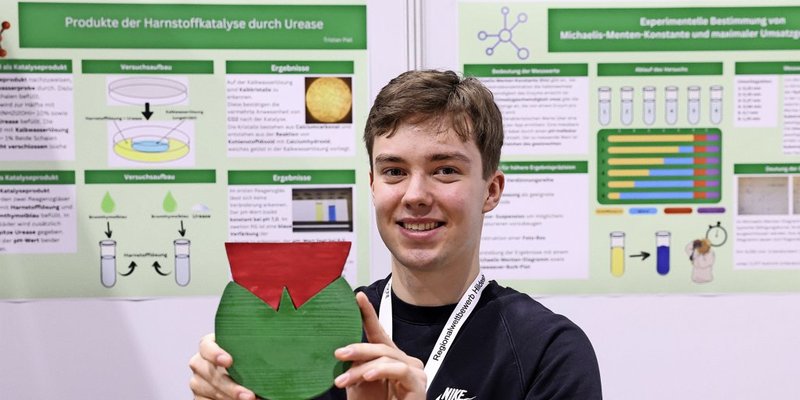 Tristan Piel vom Goethegymnasium wandte sich der Chemie zu und warf seinen Blick auf die Katalyse, also die Veränderung einer Stoffumsetzung. Dabei testete er, wie sich das Enzym Urease auf die Katalyse von Harnstoff und Kalkwasser auswirkte, sagt er – und klingt dabei schon wie ein richtiger Vollblutchemiker, der sich mit seinen Begriffen auskennt: Petrischale, ph-Indikator, Bromthymolblau.