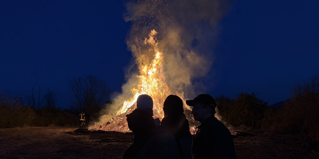 Eberholzen: Osterfeuerplatz oberhalb des Friedhofs, bei Einbruch der Dämmerung.