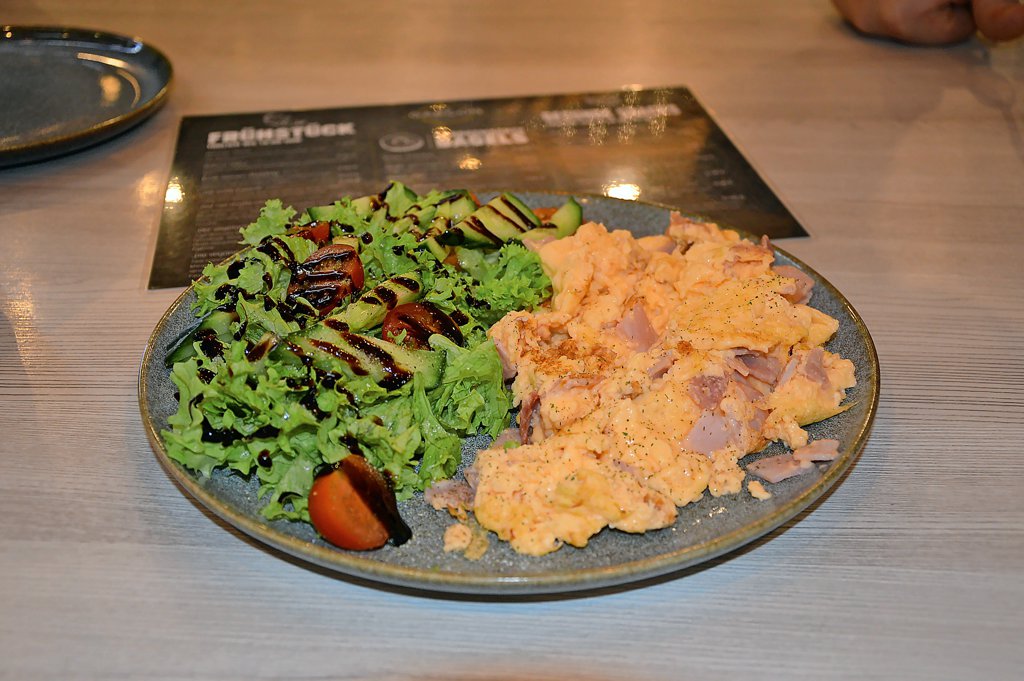 Umfangreich ist die Auswahl auch im Café Mademoiselle im Kurzen Hagen, wo es verschiedene Frühstücke gibt – mal süß, mal glutenfrei, mal vegan oder vegetarisch. „Das Ei gehört zum Frühstück dazu, das ist immer dabei“, sagt Inhaber Regif Al Omar. Selbst wenn Gäste „nur“ ein Croissant bestellen, bestellen sie oft ein Ei dazu, so Al Omar. Auch auf Sandwiches finden sich Eier, die Al Omar im Supermarkt kauft. Er rät: „Für ein gutes Omelett muss man sich Zeit nehmen, immer daneben stehen, damit es nicht verbrennt, aber auch nicht zu glitschig wird bei der Zubereitung.“ Auf Wunsch kocht er auch Eierspeisen mit Zutaten nach Wahl.