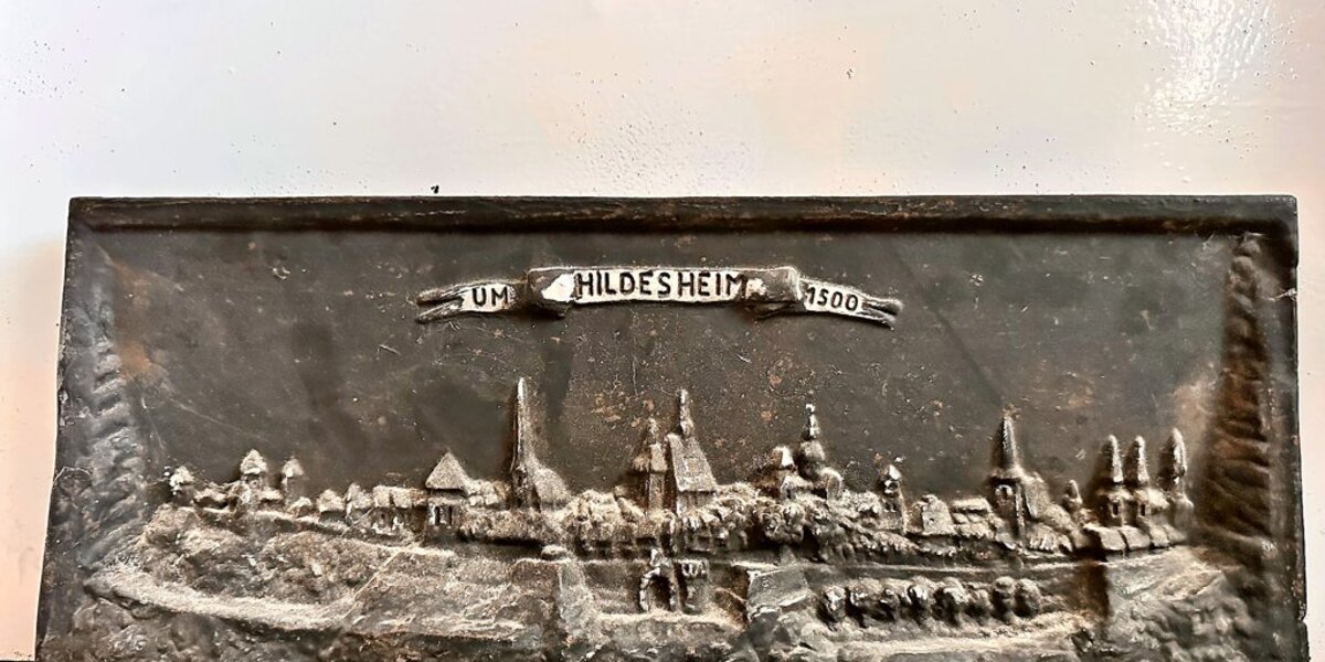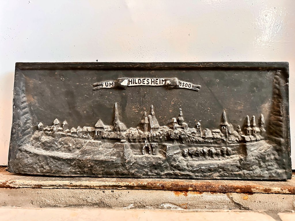 Uns dafür umso mehr. Doch was hat es mit der Kaminplatte auf sich? Woher stammt sie? Wie alt ist sie? Und was ist mit der Silhouette darauf: Ist das wirklich „Hildesheim um 1500“?