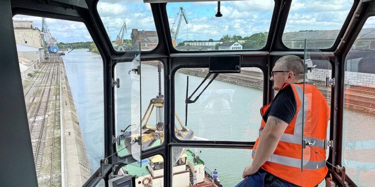 Hildesheim - Wenn man sich auf die Suche nach einem der spannendsten Arbeitsplätze der Stadt begeben würde – der von Alexander Magiera käme vermutlich in die engere Wahl. Von seiner Krankabine in rund 15 Meter Höhe hat er einen perfekten Blick über den Hildesheimer Hafen, die einlaufenden Schiffe und das geschäftige Treiben drumherum. „So ein Hafen ist schon eine richtig geile Sache“, sagt der 36-Jährige und schwenkt das stählerne Ungetüm zwischen einem riesigen Berg gebrochenem Sandstein und einem Binnenschiff hin und her. Hinter ihm surren stählerne Seile, die über Winden gleiten. Riesige, fettglänzende Zahnräder setzen den Giganten in Bewegung. Manchmal schüttelt er sich wie ein gepiesackter Riese. Um anschließend leise vor sich hin zu schnurren wie eine zufriedene Katze.