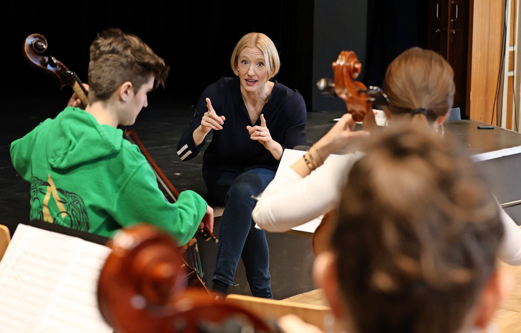 Und Mallwitz selbst? Die 38-Jährige gibt alles, schmunzelt und lacht, wird ganz ernst, so dass sich Falten auf der Stirn bilden, holt bei den Crescendi weit aus und beugt sich in leisen Passagen ganz weit nach vorne, als wollte sie förmlich in das Orchester hineingreifen. Wahrscheinlich tut sie genau das. Am Ende, nachdem sie noch zwei Schülerinnen bei ersten Dirigier-Versuchen gecoacht hat, strahlt sie und holt ganz tief Luft: „Ihr seid großartig, ihr Lieben, bitte macht weiter so! Danke, dass ich mit euch arbeiten durfte.“