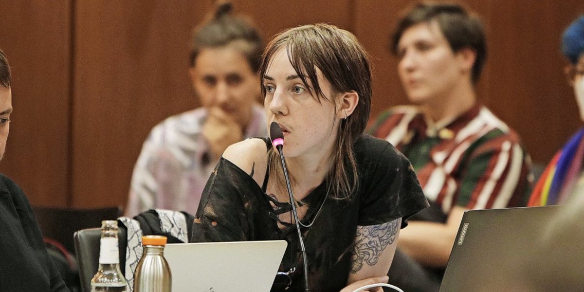 Ratsvorsitzende Franziska Hientz (CDU) fordert den IKL-Vertreter mehrfach auf, das Schild zu entfernen. Er folgt der Aufforderung schließlich, nachdem auch die Regenbogenflaggen von den Schultern der Zuschauer und Zuschauerinnen verschwinden.