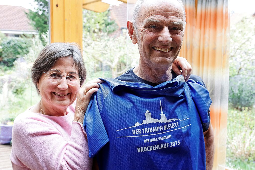 „Doch fast alle Marathonläufer kommen irgendwann an einen Punkt, an dem es wehtut“, sagt Stoldt. „Bei mir passiert das meist zwischen Kilometer 30 und 35. Dort postiert sich immer seine Frau, die auch schon mal einen etwas rustikaleren Motivationsspruch raushaut: „Lauf, du faule Socke!“ Besonders hart sei der Brocken-Marathon gewesen. Da hilft auch noch so viel Achtsamkeit nicht mehr weiter. Der Berglauf wird irgendwann zur Quälerei. Um so schöner ist das Gefühl, wenn man es geschafft hat. Stoldt präsentiert sein Shirt vom Brockenlauf 2015 mit der Aufschrift: „Der Triumph bleibt! Die Qual vergeht!“