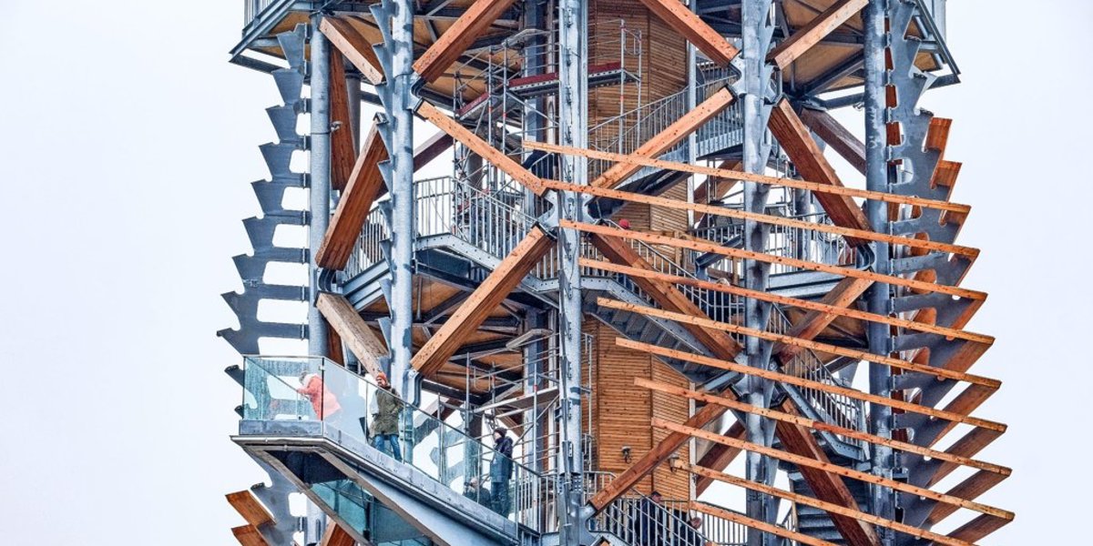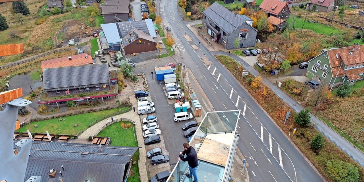 Auch schade: Die 110 Meter lange Rutsche, die sich den Turm hinunterschlängelt, ist noch nicht fertig – das Wetter war die vergangenen Wochen zu schlecht, um die letzten Handgriffe zu machen, heißt es in der Eröffnungsrede. Glaube ich sofort, als mir der Wind die nächste Gischt ins Gesicht fegt. Aber auch, wenn ich noch nicht rutschen kann und der Brocken nicht zu sehen ist: In Richtung Boden ist die Sicht frei. Besonders auf dem sogenannten Skywalk, einem Podest, das an einer Seite des Turms in die Luft ragt und komplett aus Glas besteht.